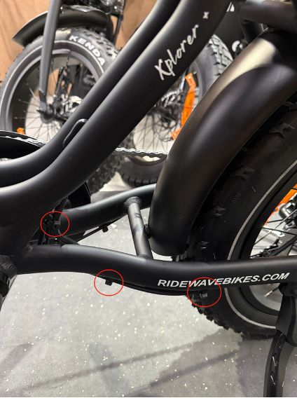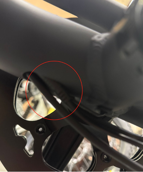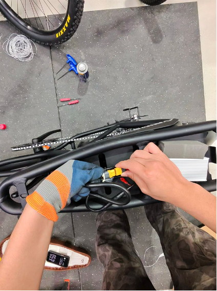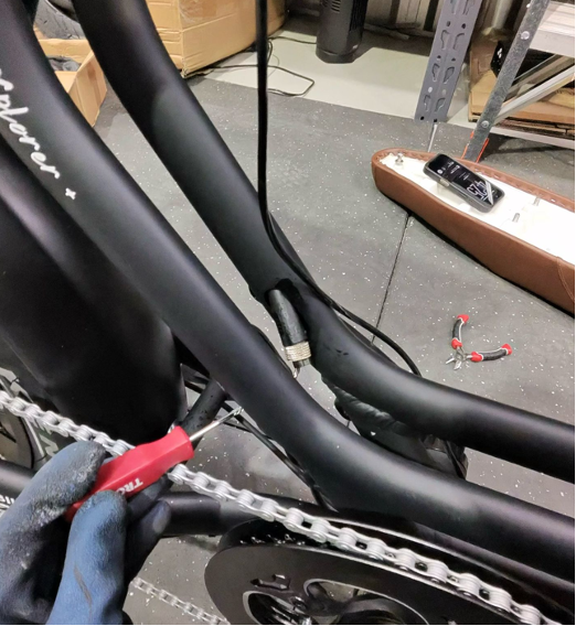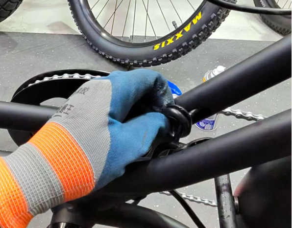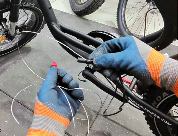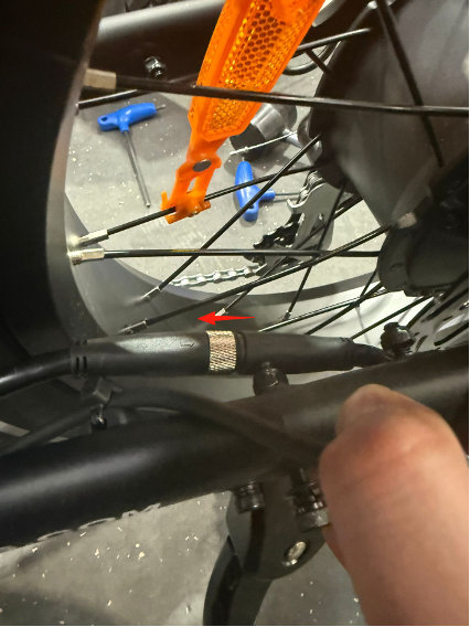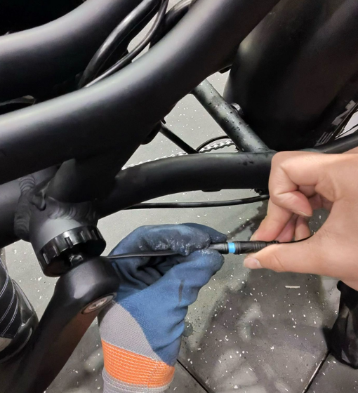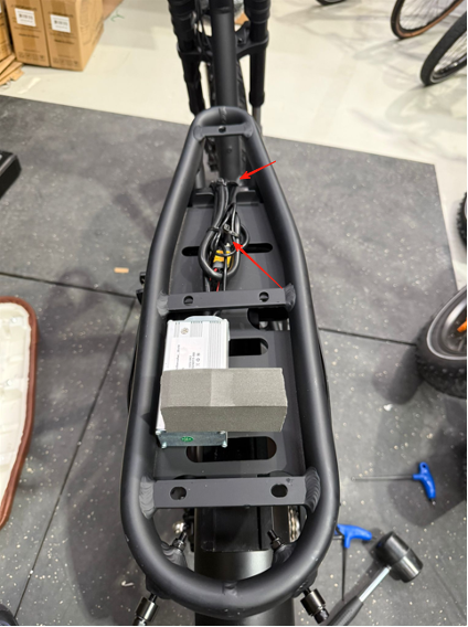 To guide the blue PAS sensor cable back through the right-hand side of the frame, you may find it easier to use a short length of brake line or a similar stiff wire. Tape the PAS cable to the line and use a push-and-pull motion from both ends to thread it through. Approximately 50 cm of brake line and a small amount of electrical tape work well for this step.