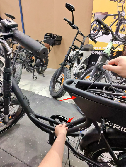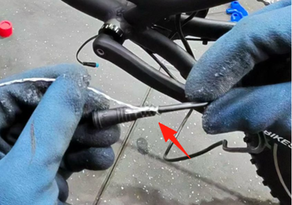 If you have trouble feeding the motor cable through the frame exit, try the same tape-and-wire method. Alternatively, a small hook tool can be used to pull the cable head out once it becomes visible. When the cable is through, connect it to the motor, ensuring the alignment arrows on both connectors line up before securing.