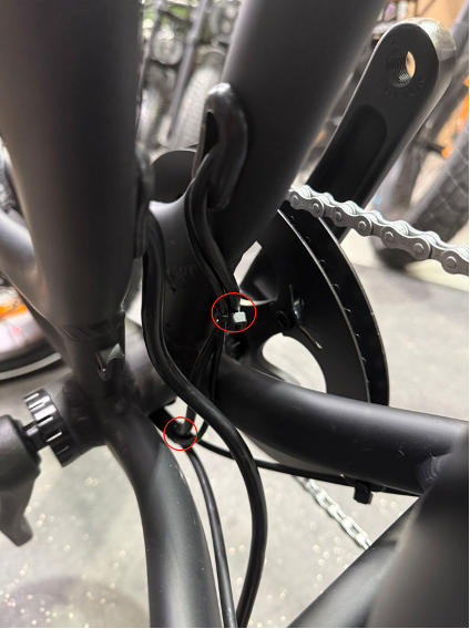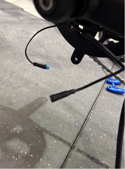 Once the cable has been successfully fed through, reconnect it to the blue PAS connector and gently push it back into position underneath the bike.