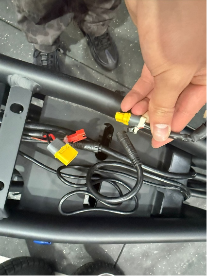 Once the seat has been removed, cut the two zip ties securing the wiring together and disconnect the three connectors near the seat area — including the XT-60 and the multi-cable connectors.