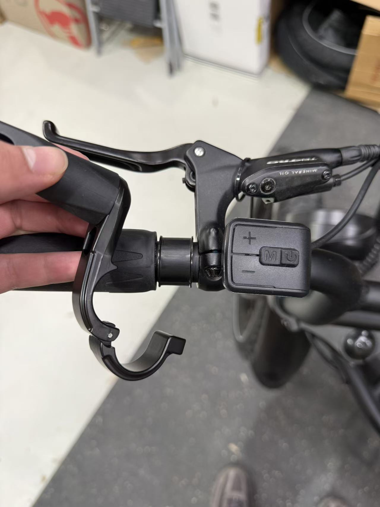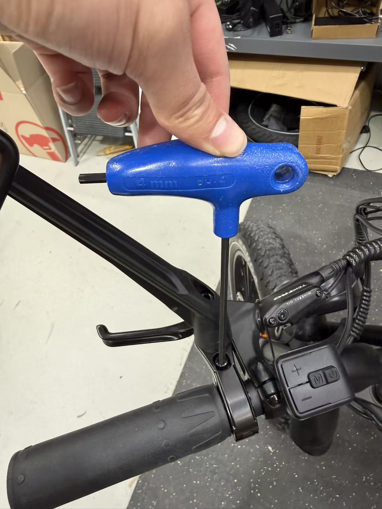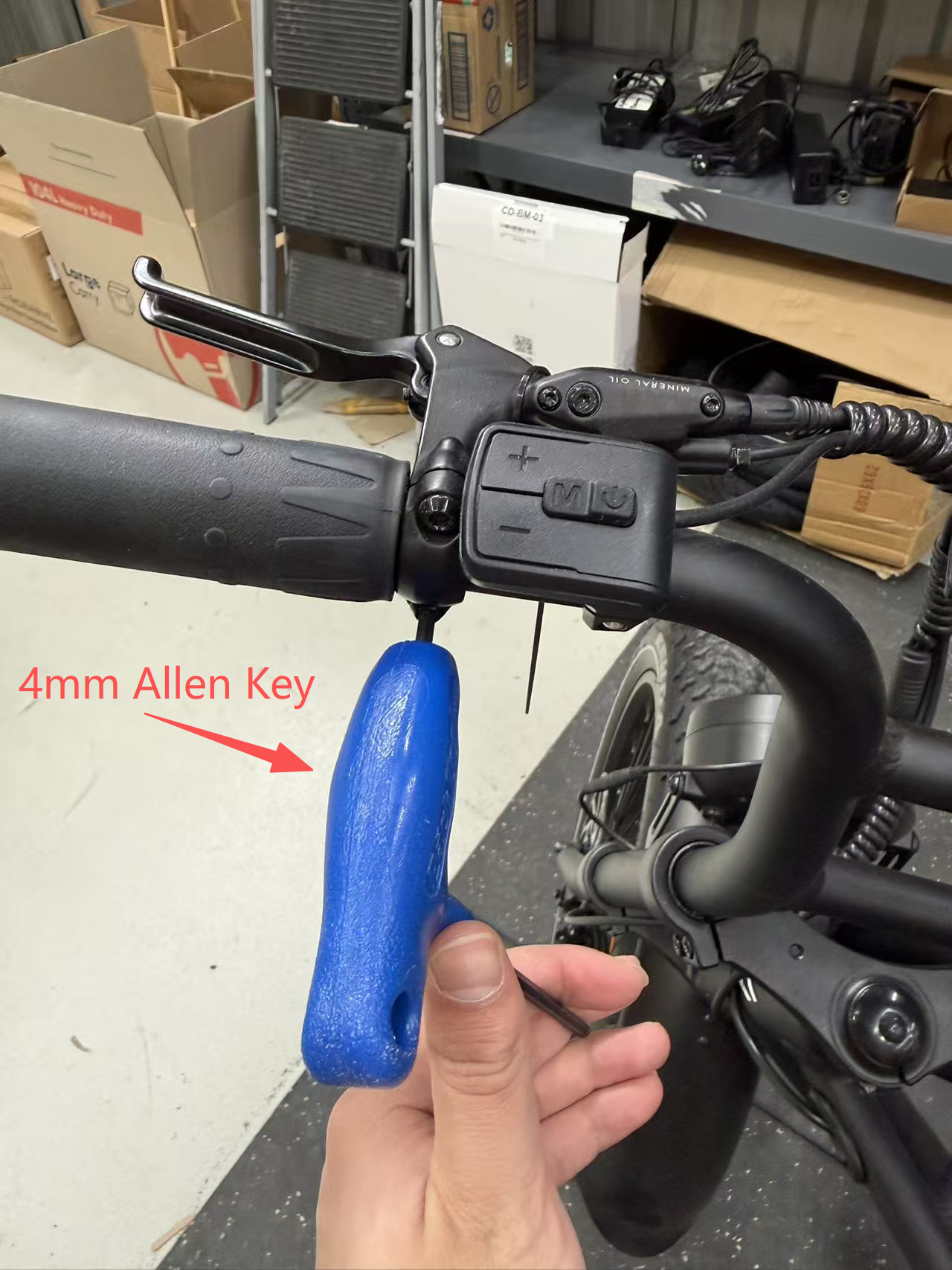 - On the left handlebar, use a 4 mm Allen key to slightly loosen the rear brake lever bolts, and a 2.5 mm Allen key to loosen the display controller clamp. Slide both components gently to the right to create enough space for installing the side mirror.