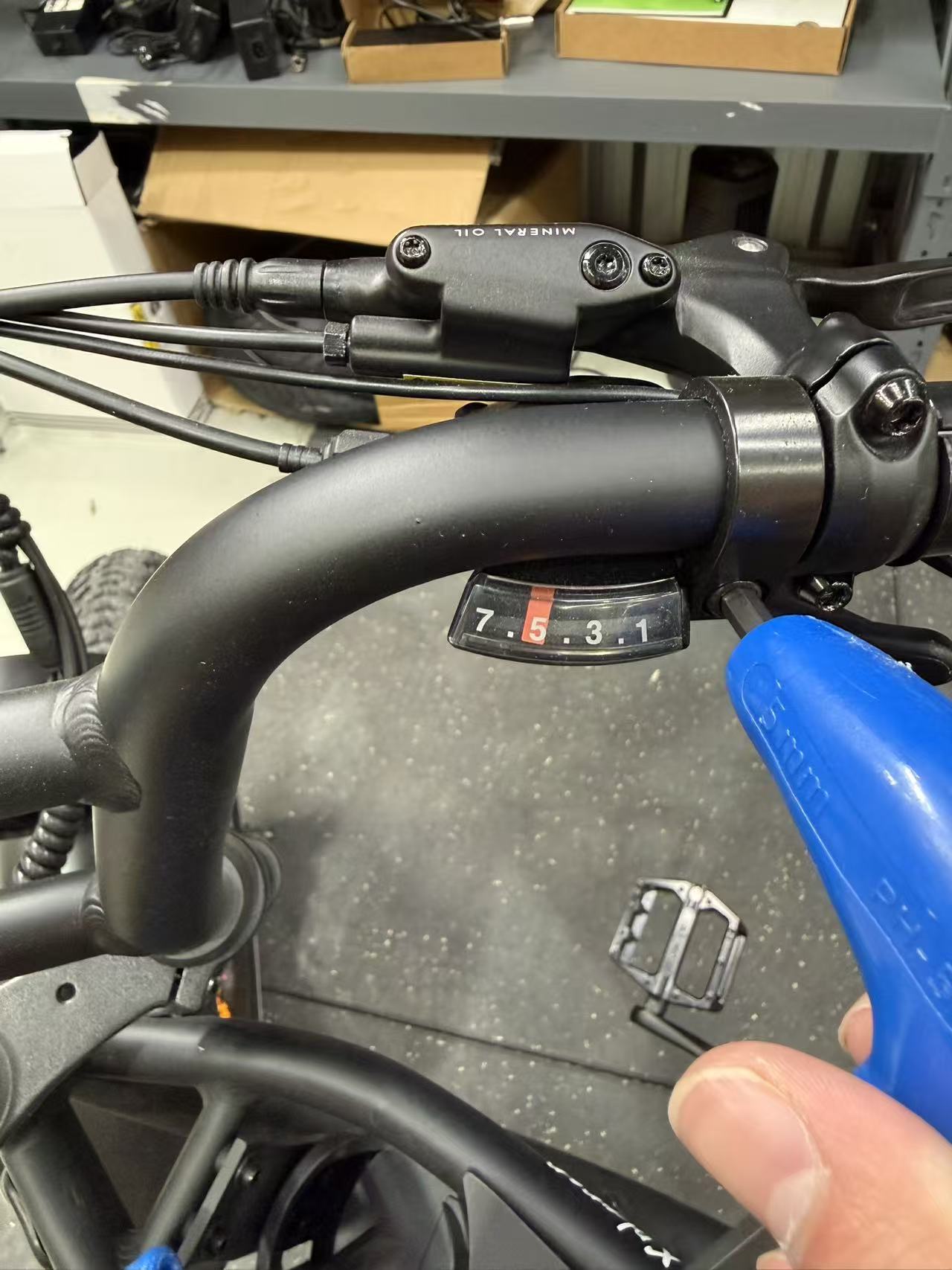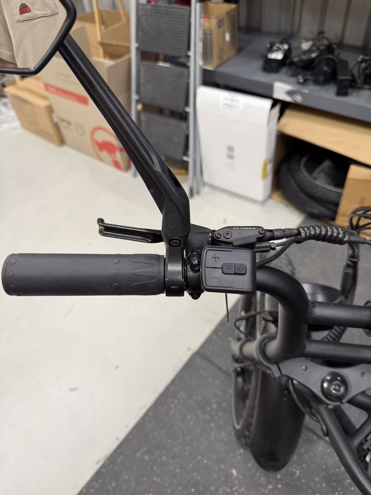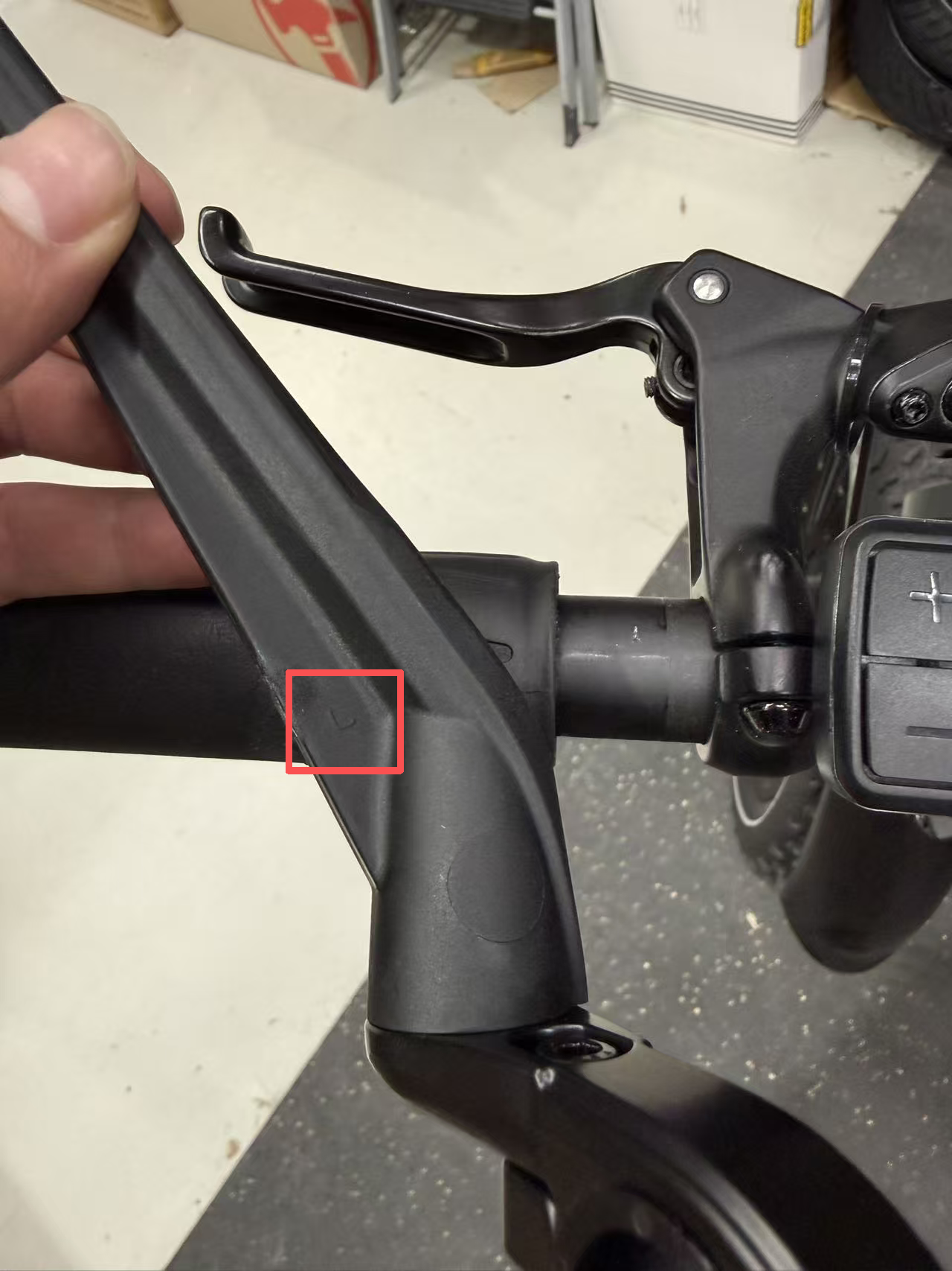 - On the left handlebar, use a 4 mm Allen key to slightly loosen the rear brake lever bolts, and a 2.5 mm Allen key to loosen the display controller clamp. Slide both components gently to the right to create enough space for installing the side mirror.