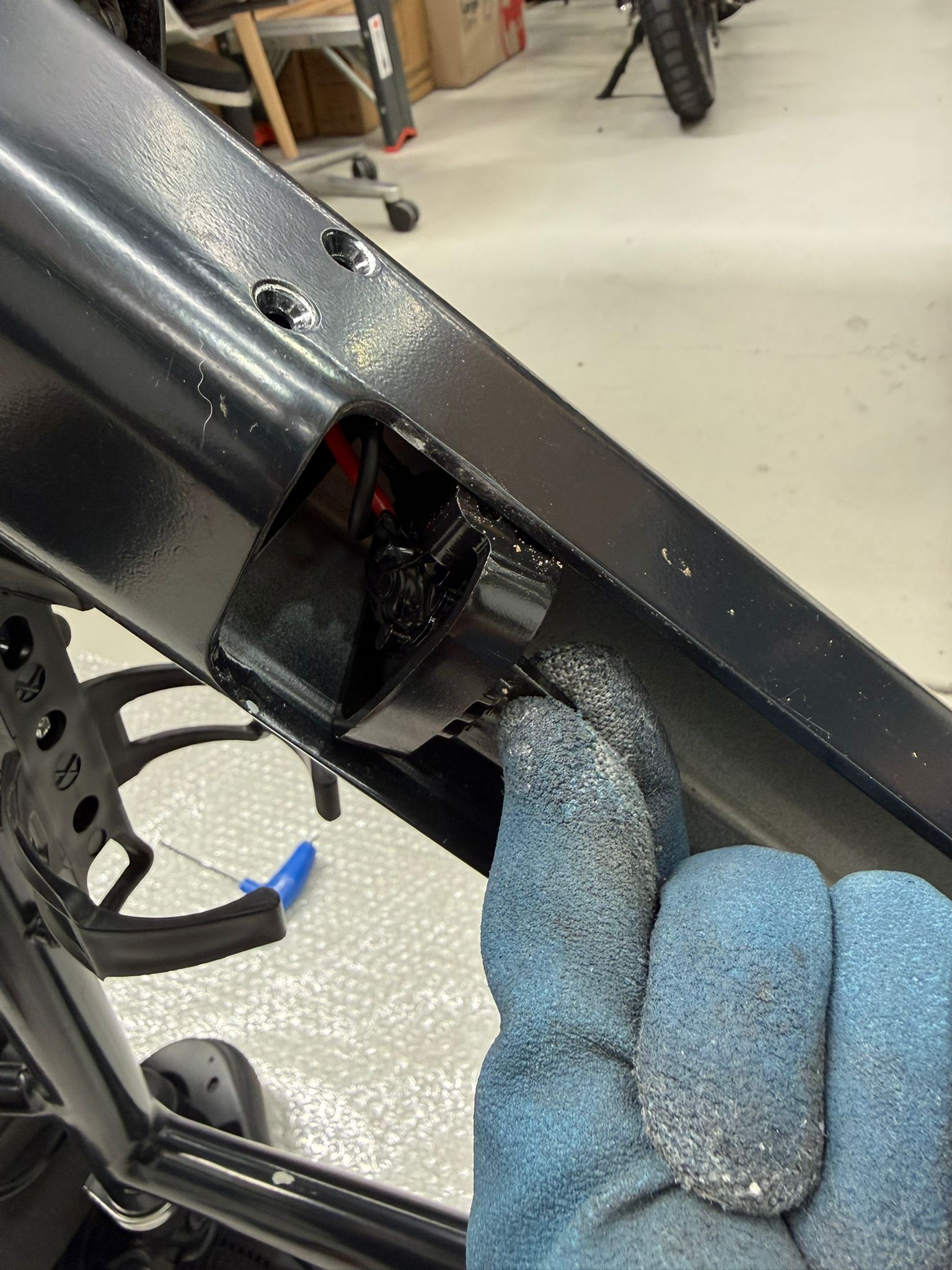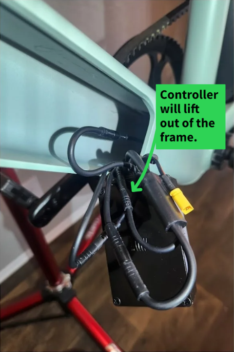 Once the motor cable is loose and disconnected, you can access the controller inside the frame by removing the lower battery panel.