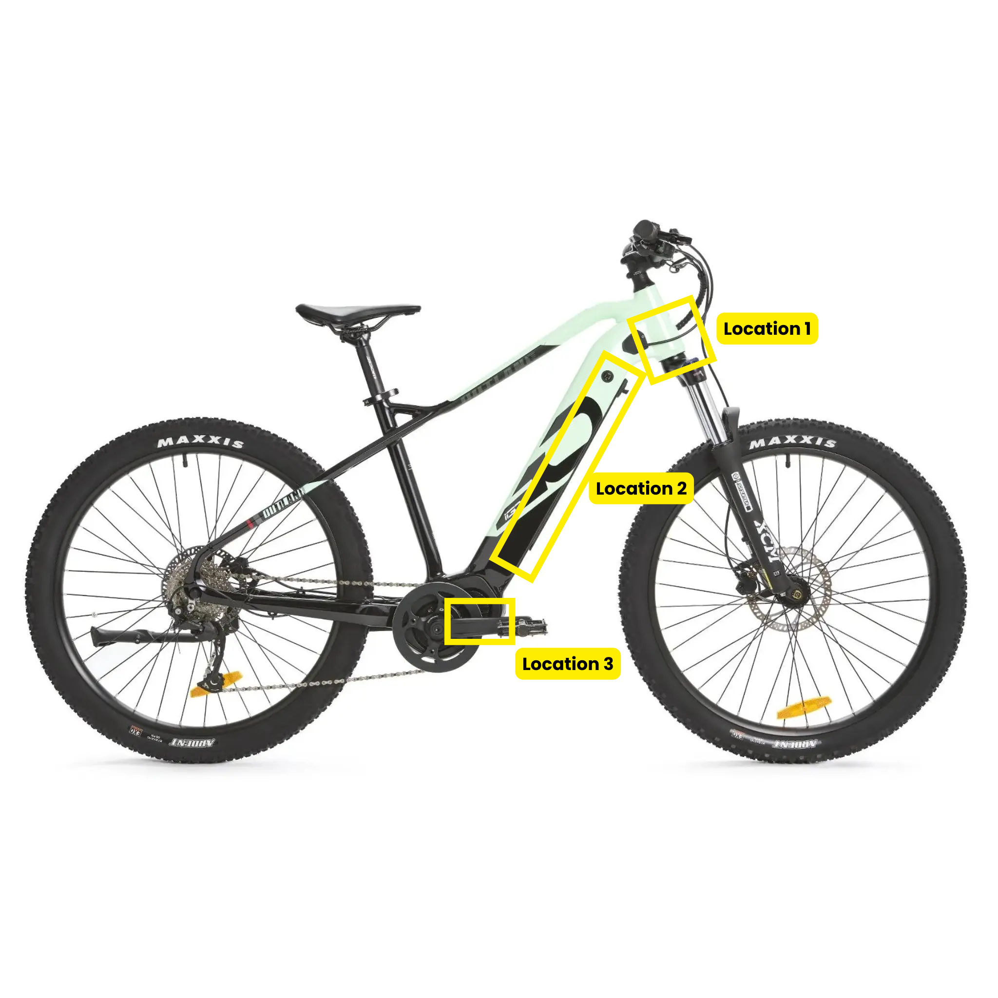 Serial number sticker is on the downtube for current generations (Location 2) - MiniWave / Glide / Urban / Outland XT